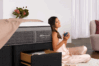Model sleeps comfortably on Sealy mattress with flowers beside bed