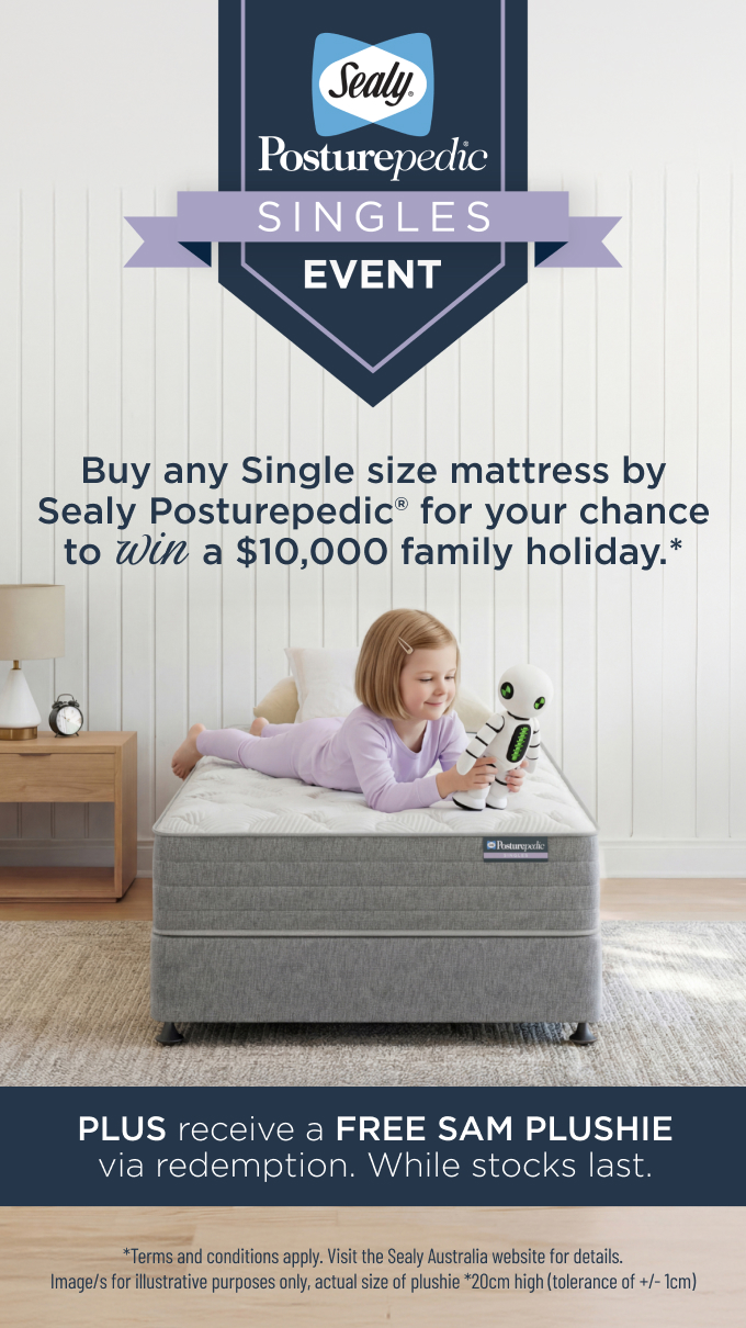 Open to Australian residents aged 18+. Buy any Sealy Posturepedic mattress in Single, King Single or Single XL size between 16 March and 26 Apr 2026 for your chance to WIN a $10,000 family holiday via Flight Centre Gift Card(s) or vouchers. Plus, receive a FREE SAM Plushie with every eligible mattress purchase (via redemption, while stocks last). Draw: 2:00pm AEST, 10 June 2026, conducted electronically at Sealy of Australia, 1299 Boundary Rd, Wacol QLD via randomdraws.com.au. Winner notified by phone or email and announced at www.sealy.com.au/posturepedic-singles-event/. T&Cs apply, see full details at https://www.sealy.com.au/posturepedic-singles-event/. Promoter: Madad Pty Ltd (ABN 57 009 678 344). Authorised under: ACT Permit No. TP 25/03035 and SA Licence No. T25/2298.